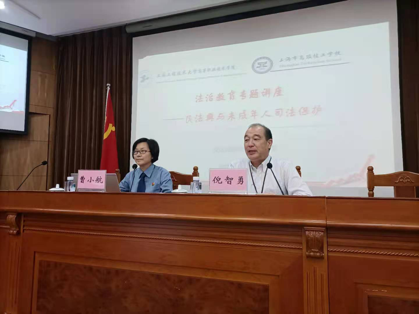为进一步深化青少年法治教育。5月21日下午,被聘为上海市高级技工学校法治副校长、高职学院、高级技校关心下一代工作委员会副主任的上海市人民检察院第二分院高级检察官曹小航,为100余名中职学生作《民法典与未成年人的司法保护》法治教育专题讲座。讲座由学院校党委书记倪智勇主持。