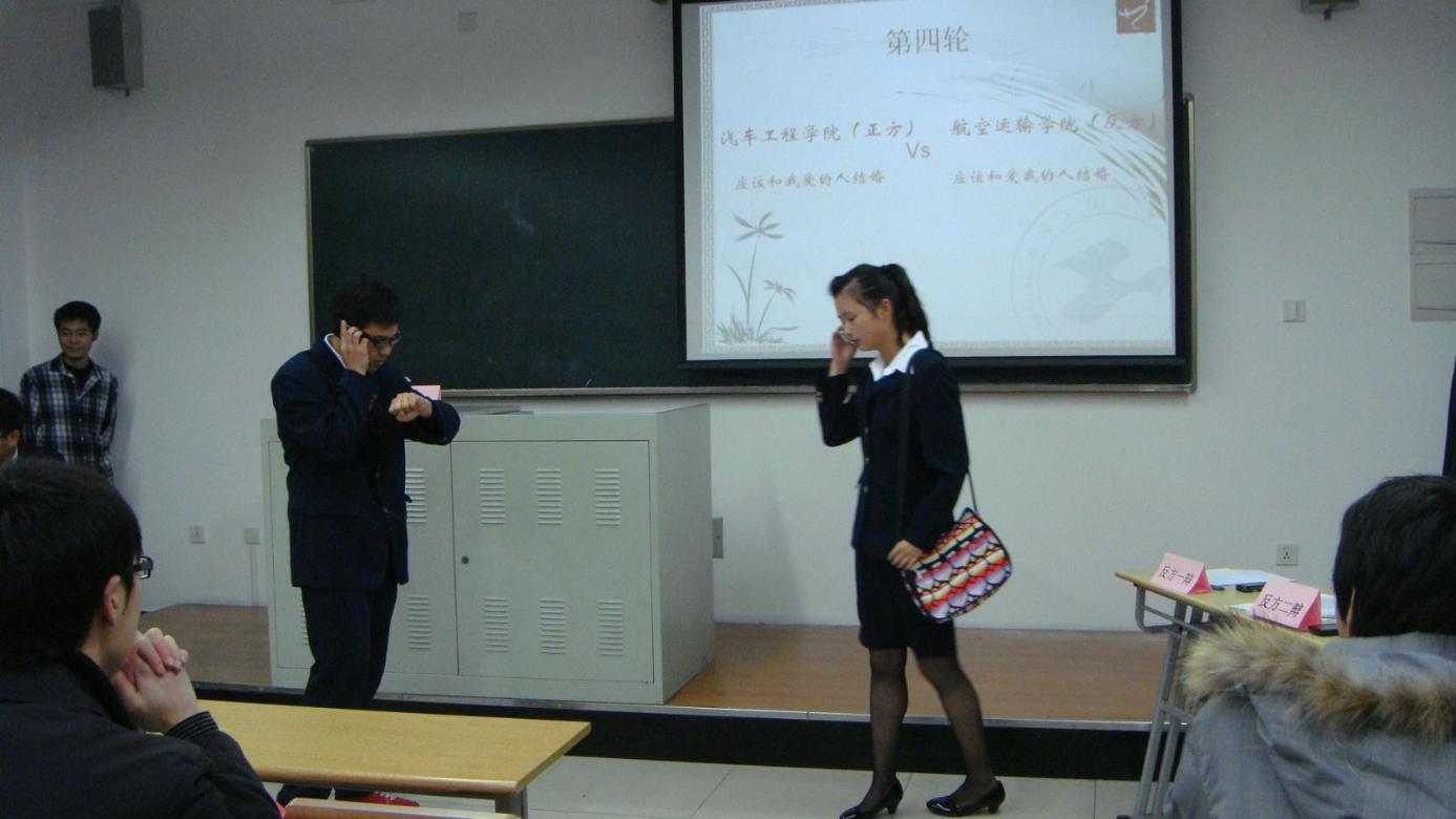 11月23日晚6:00,我校读书节系列活动之“唇枪舌剑,智战群雄”新生杯辩论赛的决赛在教学楼E310隆重举行。航空运输学院·飞行学院经过了层层挑战终于站在了决赛现场与汽车工程学院争夺此次辩论赛的冠军。 此次辩论赛的辩题是“应该是和我爱的人结婚还是和爱我的人结婚”,航空运输学院是本次辩论赛的反方,所持的观点是要和爱我的人结婚。经历了近一个月的赛期,航空运输学院的辩手们为这次决战的到来做了呕心沥血的准备。在积累了前几次的比赛经验之后,辩手们决定在本晚的辩论赛中用以情动人的风格来打动大家。 四位辩手一如既往地身着象征着航空运输学院学子身份的院服闪亮全场。在双方自我介绍环节,我院更以一场简短有趣的小品强调了我方所持的观点,赢得了一阵又一阵的掌声。立论陈词环节我方一辩吕沁沁同学以高涨的气势详细的陈述了我方的观点,而之后的攻辩环节则进行得更为激烈。火药味十足的依旧属自由辩论环节,本环节中,双方火力全开,反方的辩手更是拿出了自己家庭的实际情况作事例,甚至现场“调侃”我方的辩手。航院的辩手们在这时候则表现得较为沉稳,以理智且严密的观点予以了还击。一对一的问答不仅体现了我方辩手敏捷的反应力,更加体现了我院辩手沉着冷静的优良品质。在总结陈词环节我方辩手更是一转激烈的场面,以情动人,以情喻理。 最终汽车学院取得了本次辩论赛最终的胜利,航院一辩吕沁沁同学取得了“最佳辩手”称号。尽管没有赢得最后的冠军,我院赢回的是更加团结的凝聚力,赢回的是航院·飞院不败的气势,赢回的是四位辩手们日日夜夜所坚持不解准备的执着精神。航院的路远远没有那么短,面对未来的挑战,相信航院·飞院学子具备了更多面对困难的勇气,具备了不轻言放弃的精神,具备了接受失败的宽广胸襟。辩手们说,他们为自己能够进入此次决赛感到光荣,胜负早已不重要,因为他们已经创造了历史,他们虽败犹荣! | |