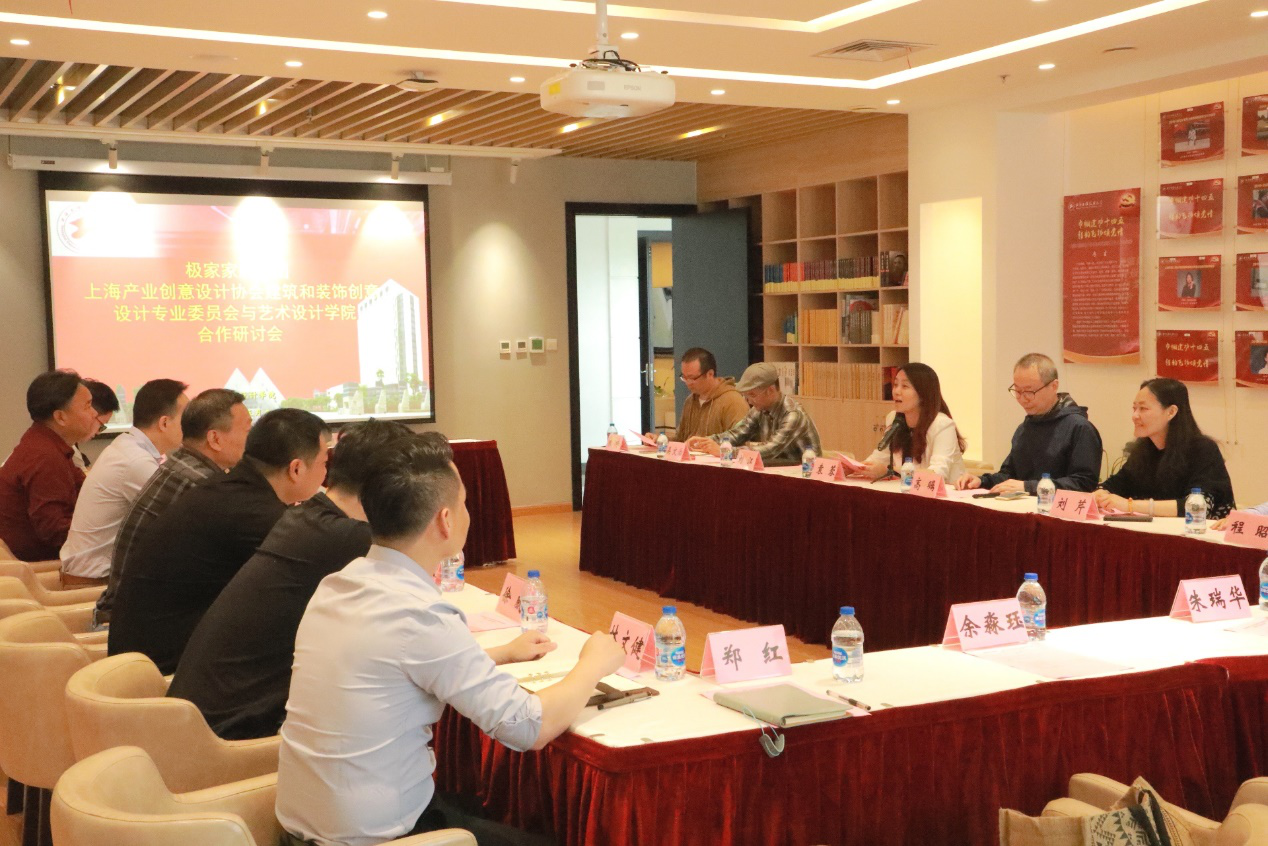 参观结束后,双方在行政楼文化之家开展“极家家居集团、上海产业创意设计协会建筑及装饰创意设计专业委员会与艺术设计学院合作研讨会”。研讨会上,袁蓉书记对任志天总裁和刘克秘书长一行的到来表示感谢,同时结合目前学院专业现状和上海市家居行业发展趋势,对未来三方开展合作事宜进行了展望。高瞩院长向任志天总裁和刘克秘书长一行展示了艺术设计学院目前所取得的成果,希望在协同创新中心建设、专业实践基地、专业教学、横纵向项目等方面与企业和行业协会建立更加广泛和深入的合作,三方一道共同打造上海家居行业新高地。