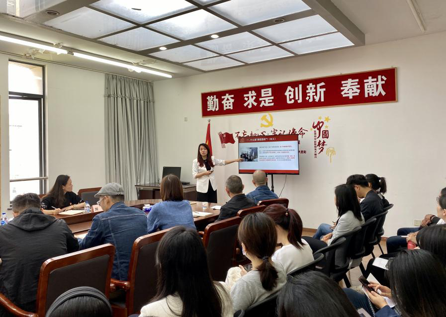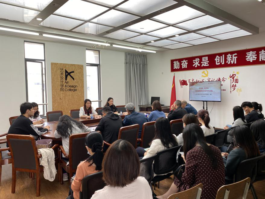 艺术设计学院党委书记袁蓉以《学党史,悟思想,推进课程思政的研究与实践》为题开展专题党课,她从延安精神谈到新时代学思悟践,围绕为谁培养人,培养什么人及怎样培养人进行了深入浅出的讲解。阐释什么是课程思政,探讨意识形态融入艺术类课堂教学的方法,为党员教师提供了方法指引。