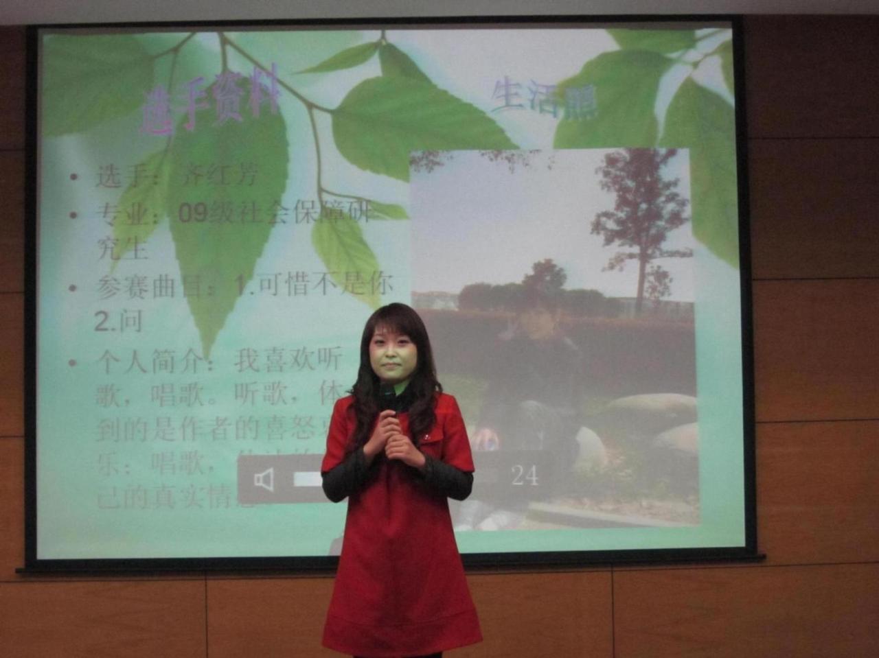 11月19日至24日,我校首届研究生校园歌手大赛在师生活动中心二楼报告厅举行,全体研究生同学参加。本次大赛共有15名参赛选手,由研究生会七名主席团成员组成专家评审团,现场同学作为大众评审。 首先,由校研会主席袁裕华宣读比赛规则,随后进入到紧张激烈的比赛环节。选手表现非常突出,现场气氛十分活跃,09级社会保障专业研究生潘文同学的一曲《知足》将大赛推向高潮。经过激烈角逐,冠军由《知足》的演唱者潘文获得;第二、第三名分别是演唱《可惜不是你》的齐红芳和演唱《不爱我放了我》的顾文俊;同时,潘文夺得了“最佳人气奖”,朱明年 、侯悦夺得“最佳舞台奖”,顾瑶媛夺得“最佳创意奖”。 最终,经评分推选潘文、齐红芳、陈之中、顾文俊、顾瑶媛五名选手,于11月26日代表我校研究生参赛队伍赴上海对外贸易学院参加首届上海高校研究生“唱响思源”校园歌手大赛复赛。 团委 彭秀明 林佩芳 | |