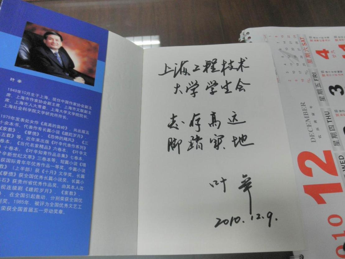 此次访谈是以我校校园文化活动和学生干部培养为背景展开的,在交流过程中学生干部与叶辛老师就当代大学生的文学观、读书情况以及大学生人文素养等问题进行了亲切交流。叶辛老师还在其知名作品《孽债》一书中题上了“志存高远,脚踏实地”,以寄予其对工程大学子的厚望。访谈的最后,校学生会诚挚邀请叶辛老师于12月下旬来我校作公开讲座,让我校学生近距离领略大家风范。 在学生干部与叶辛老师的交流之中,叶老师作为一名在文学界德高望重的前辈、作家,展示着他深厚的文学功底和艺术素养,也深深地影响了在座的每一位学生干部,使他们不断受到启发,受益匪浅。 | |