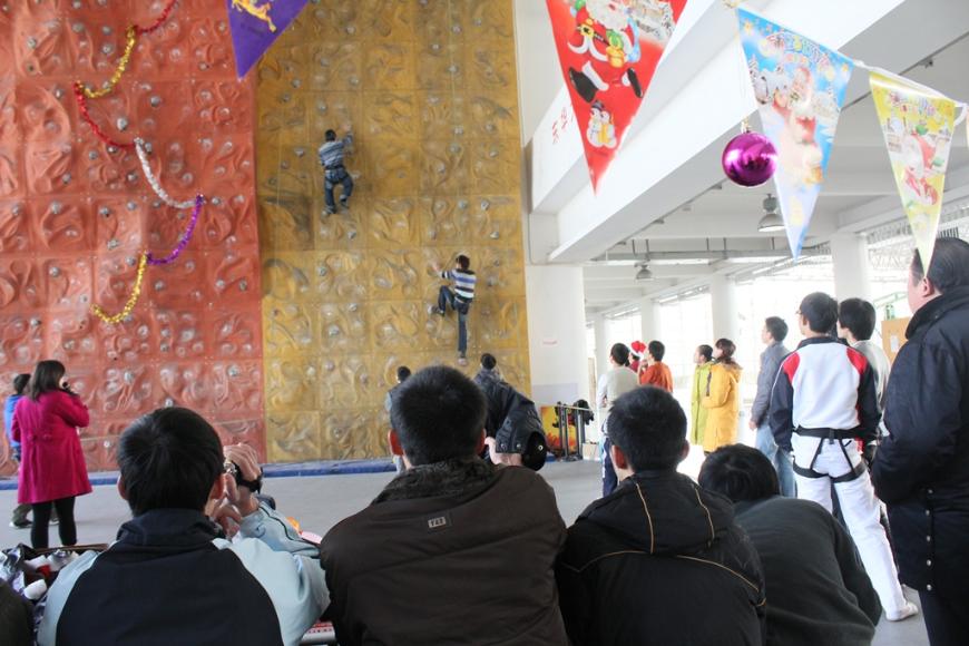 首先进行的是第一届七校攀岩交流赛,10:00交流赛准时开始。做好准备活动后,参赛选手依次上场。速度赛是技术与速度的结合,很具观赏性,观众们看到选手们的出色表现连连拍手叫好。然而,最令人感动的一幕是工程大的女选手吴仕菊在攀到中途受到阻碍时没有放弃,坚持尝试着继续往上攀,赢得了评委们的一致赞赏。 而之后进行的攀石比赛是采用自我计分的形式。比赛中,同学们在高手的指点下也学会了很多技巧。比赛在12:00结束,在整场攀岩交流赛中,我校攀岩队的队员表现突出,获得了不错的名次。下午14:00进行了交流赛颁奖仪式,获奖选手拿着手中的奖品,即是他们成绩的见证,同时也是一份特殊的圣诞礼物。紧接着,“圣诞攀岩party”正式开始,派对在一片欢快的气氛中进行着,武术、舞蹈、歌声、笑声充满着整个体育馆。所有人都被这美好的节日气氛感染着,这个冬天似乎并不那么冷了。大约在下午16:00派对才在大家依依不舍中结束了。 此次活动既提供了很好的校与校之间的交流机会,又促进了同学们的友谊,同时也让同学们感受到了一个不一样的圣诞节。 | |