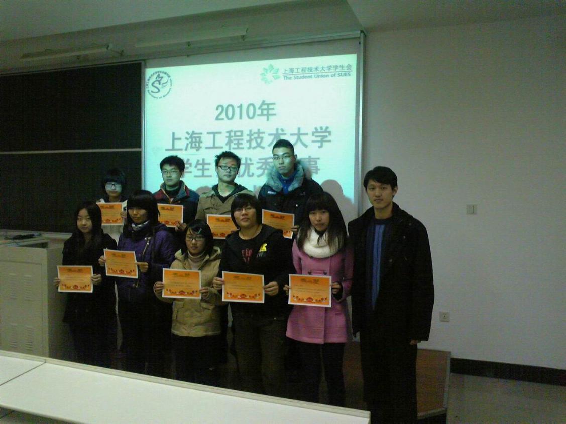 王佳杰老师宣读了优秀干事名单,并与学生会主席郭谦等一同为各优秀干事颁发奖状,来自各部门的优秀干事代表也分享了一年来的工作感悟和经验心得。随后,校学生会主席郭谦同学和主席助理李振奇同学带大家回顾了今年的工作。 2010年是校学生会硕果颇丰的一年,在全体学生会成员的无私奉献和努力工作下,世博会志愿者先进事迹报告团、九大节等一系列反响强烈的校园文化活动顺利开展,学生会对此一并感谢大家的辛勤付出。 会议临近尾声时,老师和学生会干部祝各位干事在兔年身体健康,学业有成,并鼓励干事们再接再厉为学生会发光发热。 | |