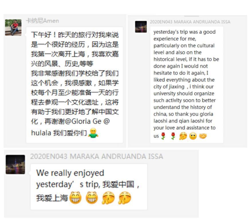 一大会址的探访之旅结束后,我校国际学生都踊跃地分享了活动心得。来自刚果的壮壮说:“这次嘉兴之行,不管在文化层面上还是在历史层面上,对我来说都是一次非常棒的经历,如果还有这样的活动,我一定会毫不犹豫地报名参加,我非常享受这样的活动,我爱中国,我爱上海。”来自卢旺达的阿门说:“此行对我来说是一个很好的经历,因为这是我第一次离开上海去其他城市参观,我喜欢嘉兴的风景和历史,我非常感谢我们能有此次机会聆听中国的故事。”
