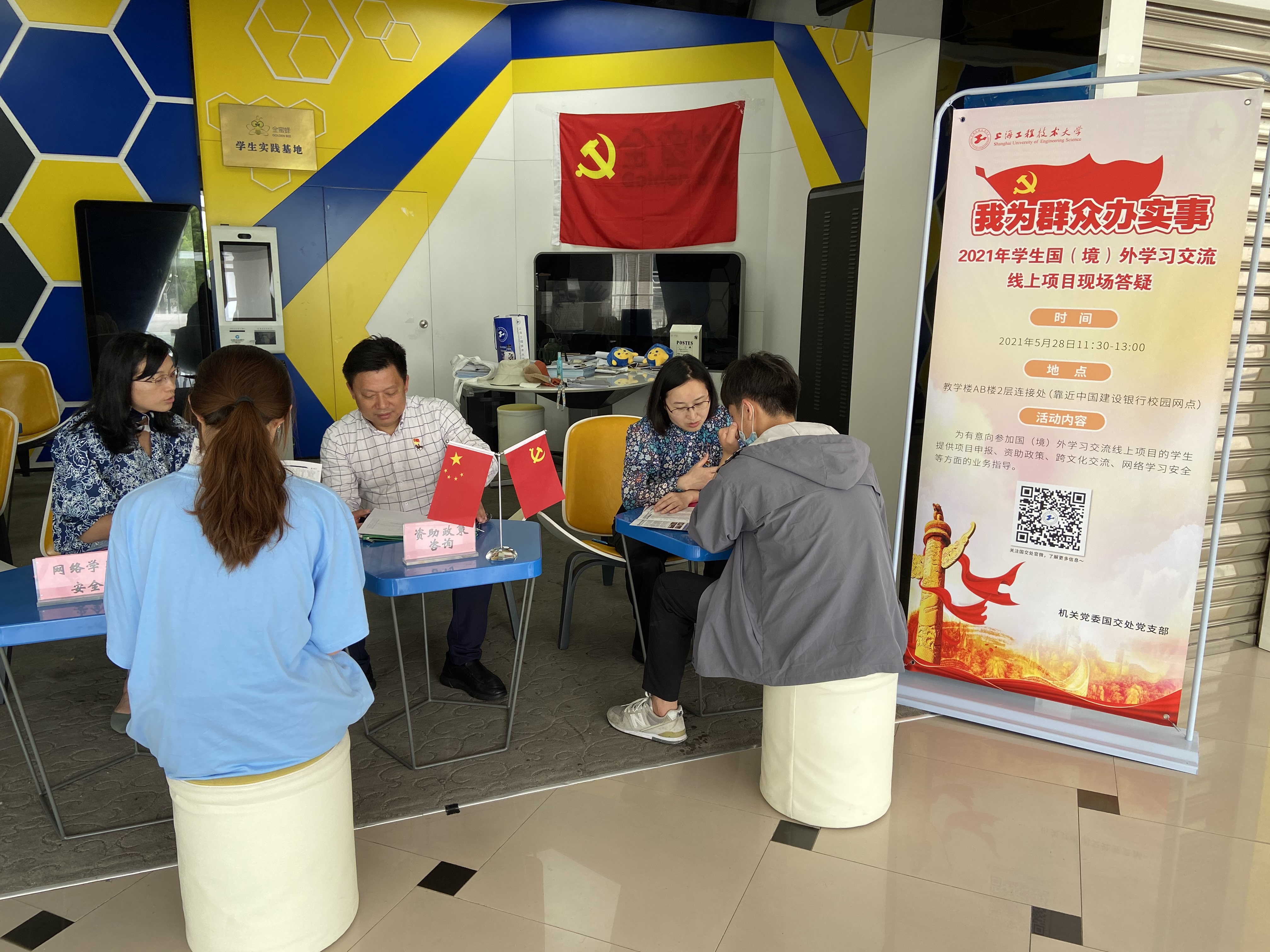 为深入推进党史学习教育,积极落实“我为群众办实事”,机关党委国交处党支部于5月28日中午在教学楼开展“2021年学生国(境)外学习交流项目现场答疑”活动,国际合作与交流处全体党员和团员青年一起为学生答疑解惑,机关党委委员、校办主任曾国辉特邀参加活动。