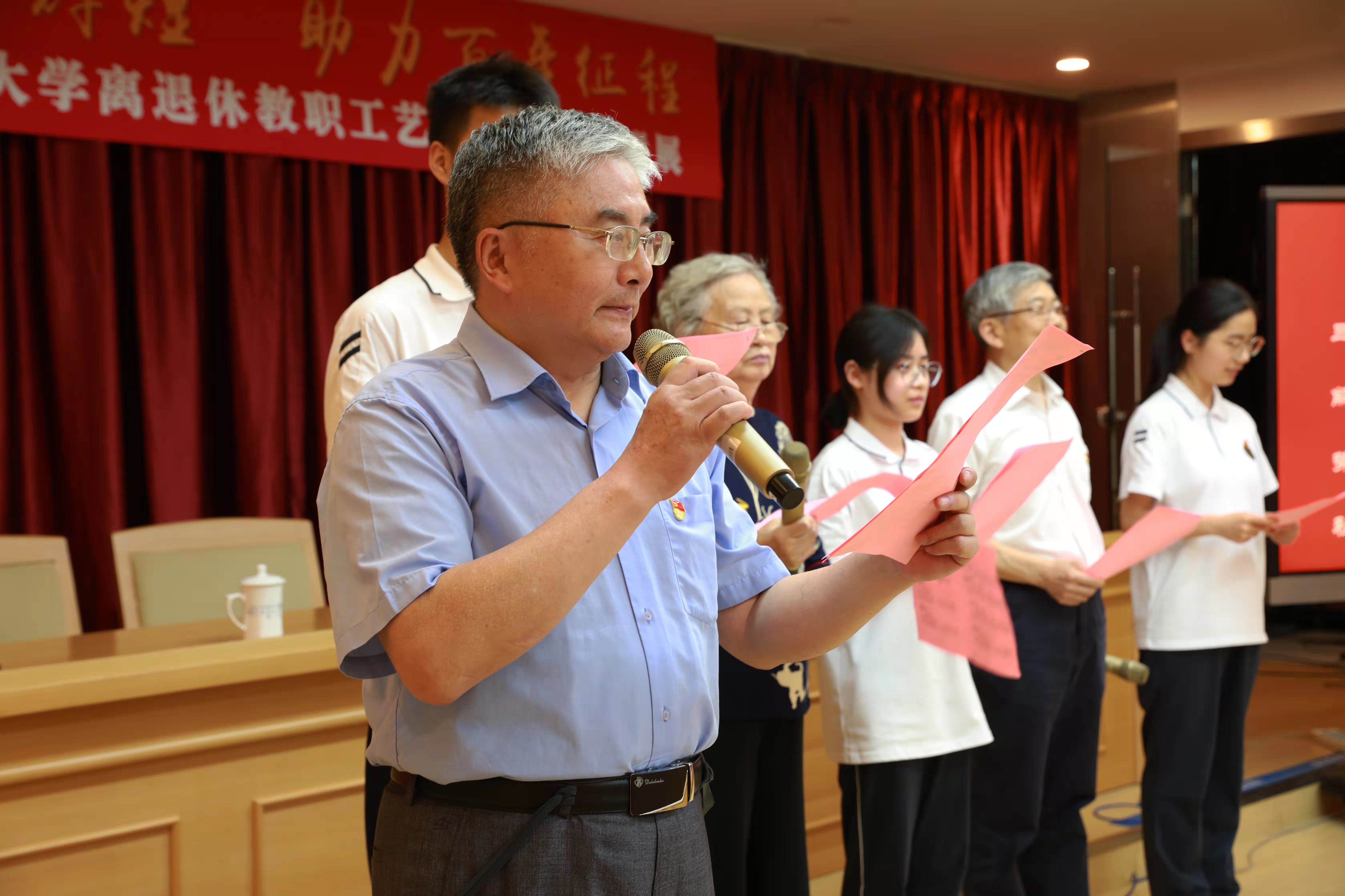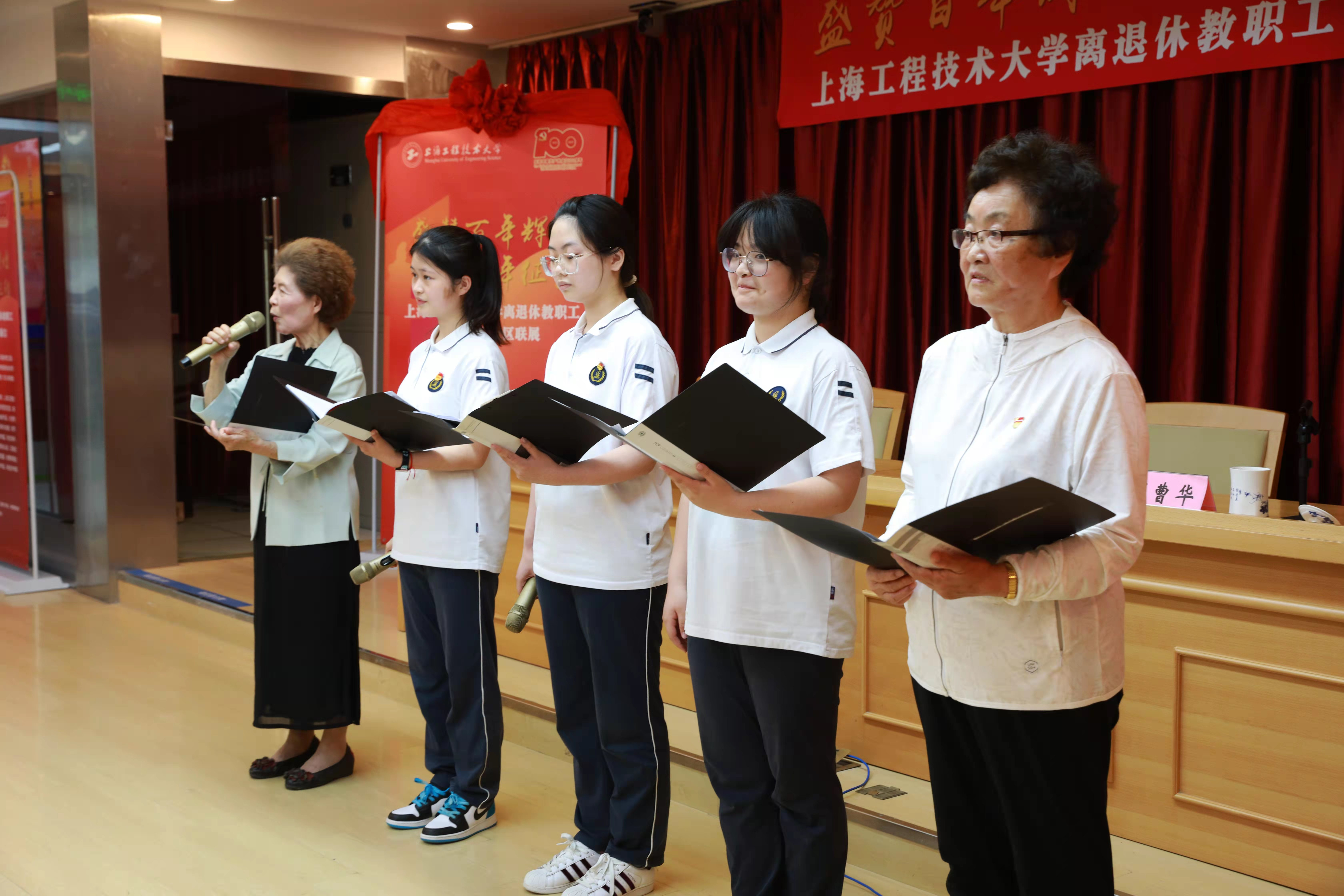 退休教工代表汤万庆现场展示了书法创作。朱雪冬、赵卫东、曹丽纳、吴德清老师携手现代职业技术学校学生代表一起演绎诗朗诵《百岁华诞颂辉煌》,获得阵阵掌声。
