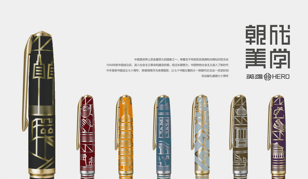 姚惠副教授作品设计理念源自中国书画术语“书画同源”。深度剖析中国各朝人文、建筑、历史等元素,并进行符号化,开发了“英雄100号米字设计规范”,先后设计了“秦汉唐宋元明清”专属图案,浓缩了中国朝代美学符号。笔尖采用14K纯金笔尖,在保证书写顺畅的前提下提升弹性触感。笔身与笔帽,采用了双色套杆镀金工艺,与高透亚克力光线折射下的文化元素相得益彰,与英雄金笔“质量第一,以人为本,赶超先进,追求卓越”的品牌文化和经营理念相呼应。