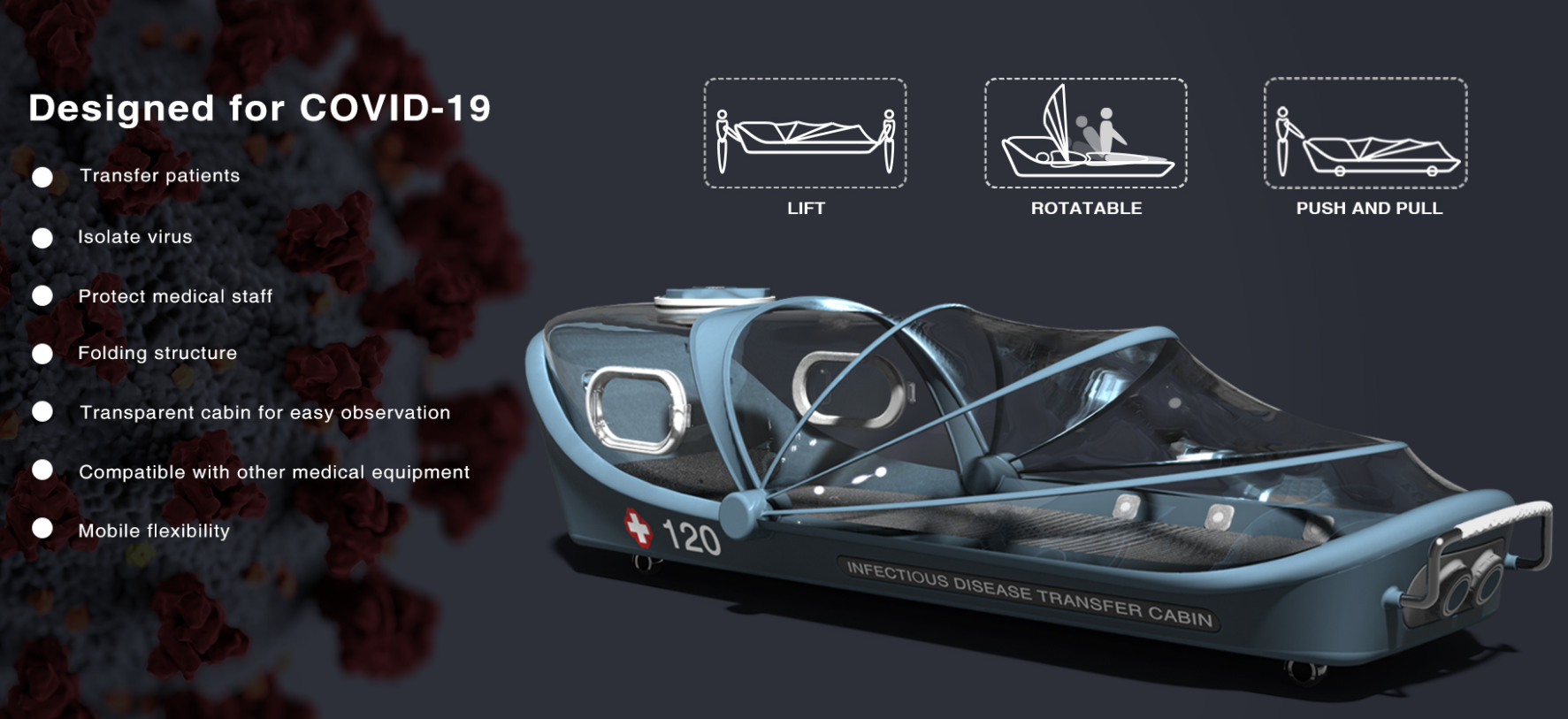 金薇薇副教授团队作品是一个模块化的隔离系统,主要功能为运送传染病患者,经过2020年初的新型冠状病毒危机,我们能够清晰的认识到,医疗器械在医护领域的重要性,尤其在传染病病人的运送过程中,医护人员和转运人员承担着被感染的风险,且在转运过程中易对周围环境造成感染,该医疗系统旨在患者装载和运输过程中实现最高的安全性和多种治疗方法的可能性,保护患者免受环境的二次感染,其可翻折的舱盖系统可以便于患者顺利进入转运舱,避免了舱体与舱盖之间的繁琐操作,可以推拉,在停靠医院病房时同样可以冲做临时病床使用,能够缓解医院病床匮乏的局面。