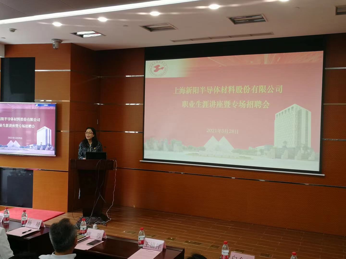 5月28日,上海新阳半导体材料股份有限公司来我校举办专场招聘会,公司董事长王福祥、副总经理白金香及机械与汽车工程学院党委书记虞蓉、党委副书记王东阳、学生工作部(处)副处长缪琳出席招聘会,会议由王东阳主持。