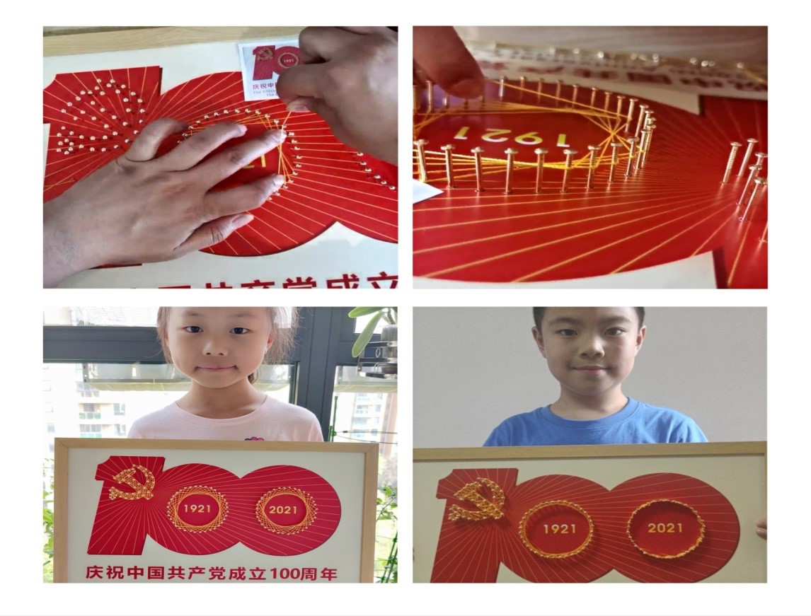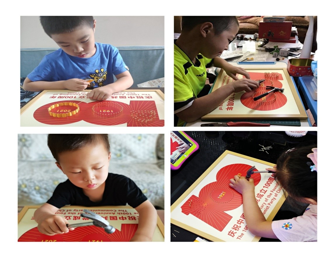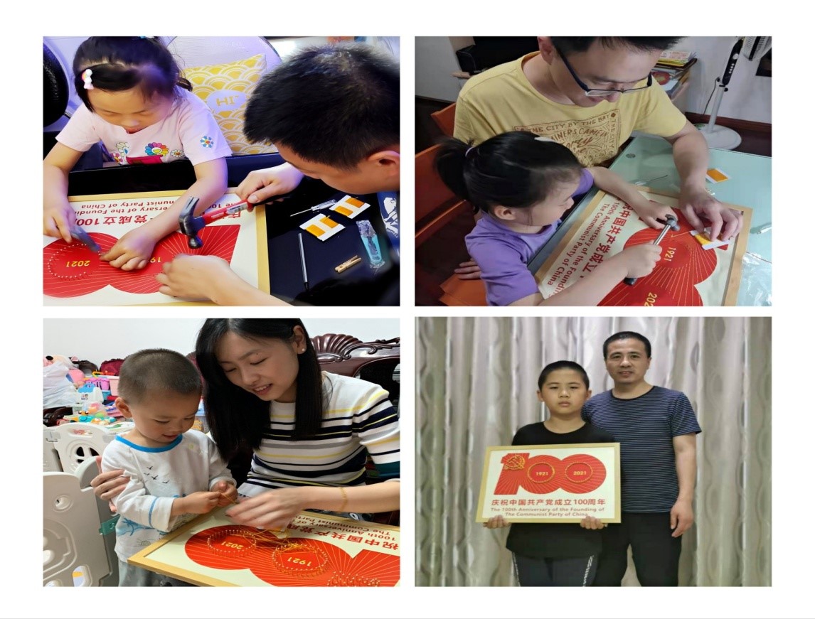 活动开始前,小朋友在家长的带领下,早早地摆放好工会下发的材料包中的工具和材料,迫不及待地等待着活动的开始。活动中,孩子们在家长的协助下,有模有样地跟着视频中指导老师的讲解一步步地操作,在群里展示孩子们亲手制作完成的作品展,一幅幅精美作品展示了孩子们爱党、爱国的自豪感和使命感,厚植家国情怀,传承红色基因。活动在指导老师的赞扬声中圆满结束。