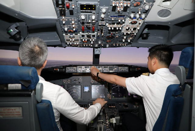 飞行员在模拟机内体验驾驶场景
