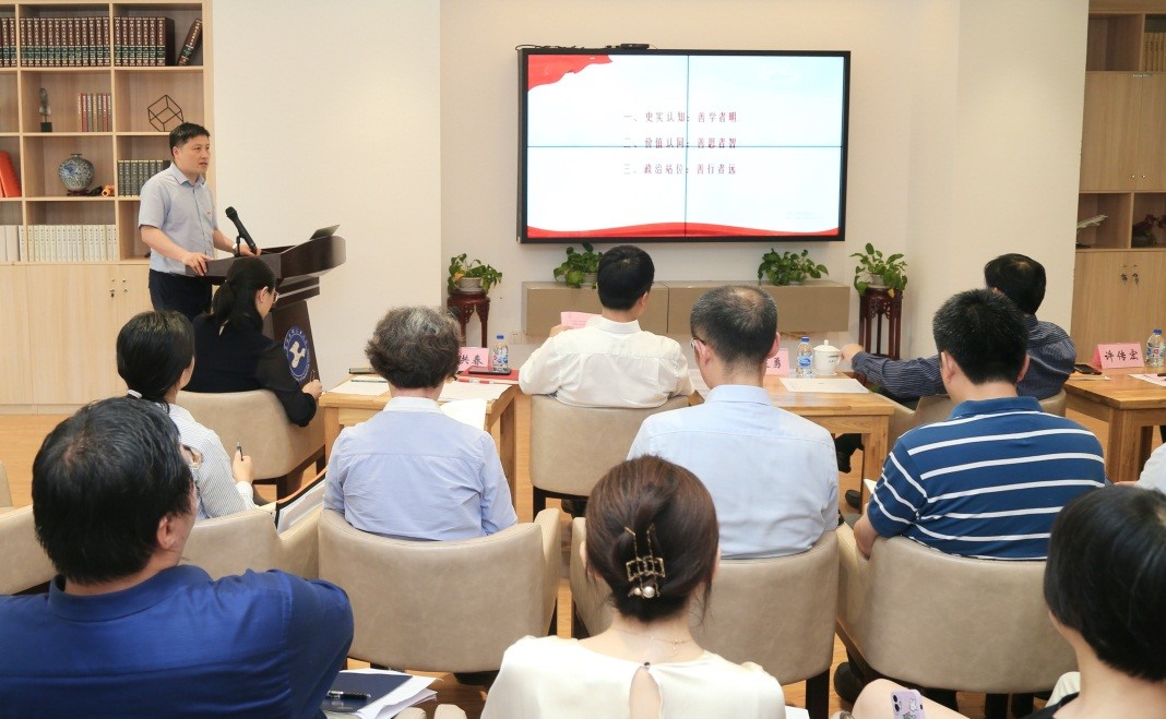 会议邀请马克思主义学院副院长严运楼教授作习近平《论中国共产党历史》导读,他从书籍出版背景、总体面貌、核心思想等几个方面,完整展现了习近平《论中国共产党历史》的理论意蕴和内在逻辑。他谈到,《论中国共产党历史》是一本系统的、完善的体现习近平总书记论党的历史重要内容的著作。蕴含其中的宏大史观,是我们认识党的历史的一个重要的认识方法,要学习运用宏大史观的角度来看党的历史、学习党的历史。