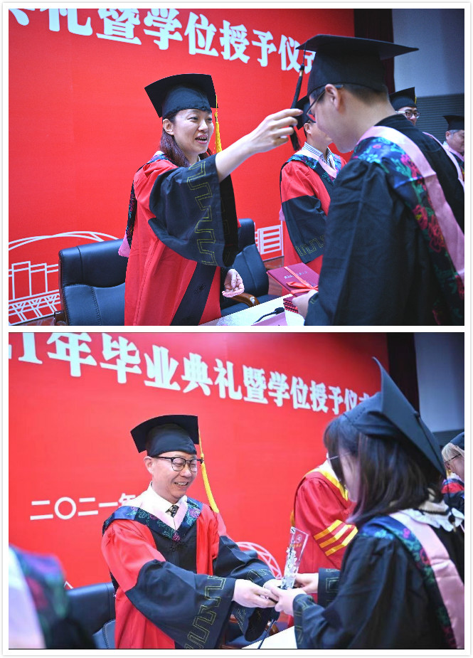 在学位授予仪式中,246名毕业生从老师们手中接过鲜红的毕业证书,闪光灯将他们最美丽的笑容定格在了母校。授予仪式后,毕业生纷纷将鲜花献给陪伴自己成长的恩师,感谢老师们的辛勤付出。一场充满感动和温馨氛围的毕业典礼圆满落幕,一场具有深刻含义的人生仪式将永远记在每一位毕业生的心里。
