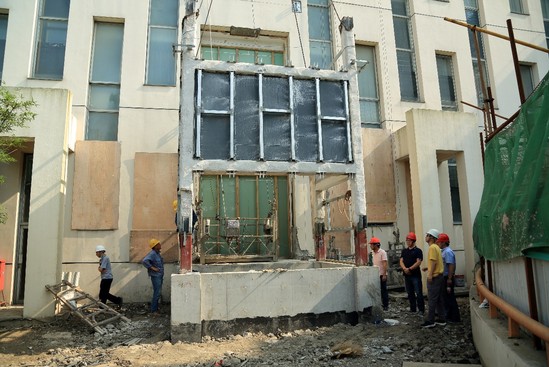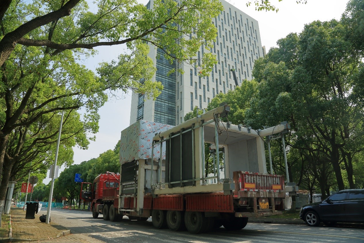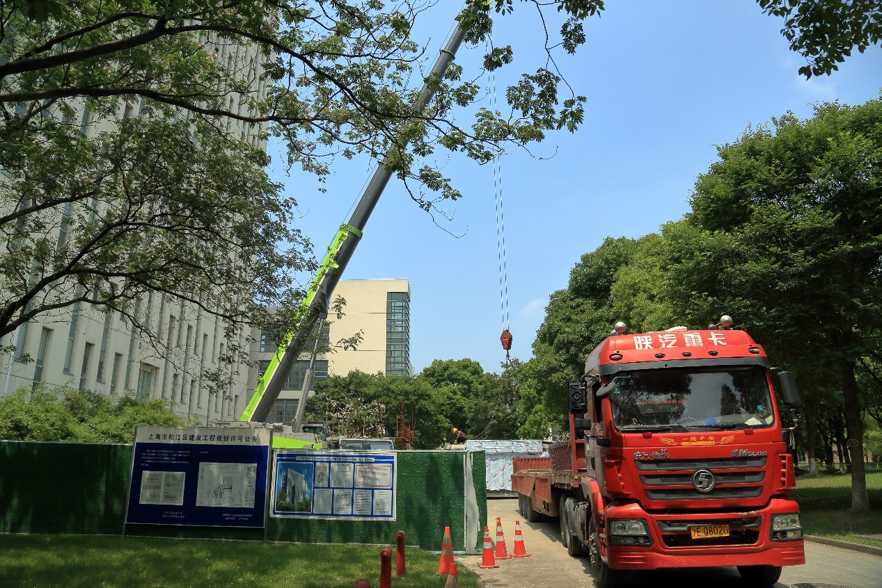 在施工单位精心准备下,早晨5点七段钢结构开始从临时堆放点转送到行政楼主楼北侧电梯施工现场,钢结构从转运到现场就位持续作业十小时,基建处进行了全程安全监控。