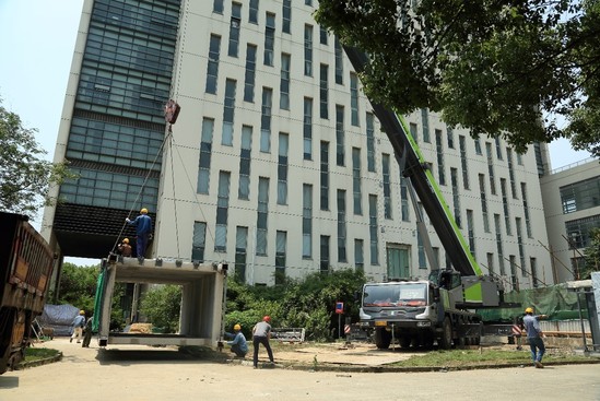 6月12日,经过前期施工准备,行政楼电梯加装改造工程进入电梯钢结构现场吊装组合阶段。基建处组织施工监理单位和施工单位负责人到达行政楼北侧进行了全程监督和现场调度。