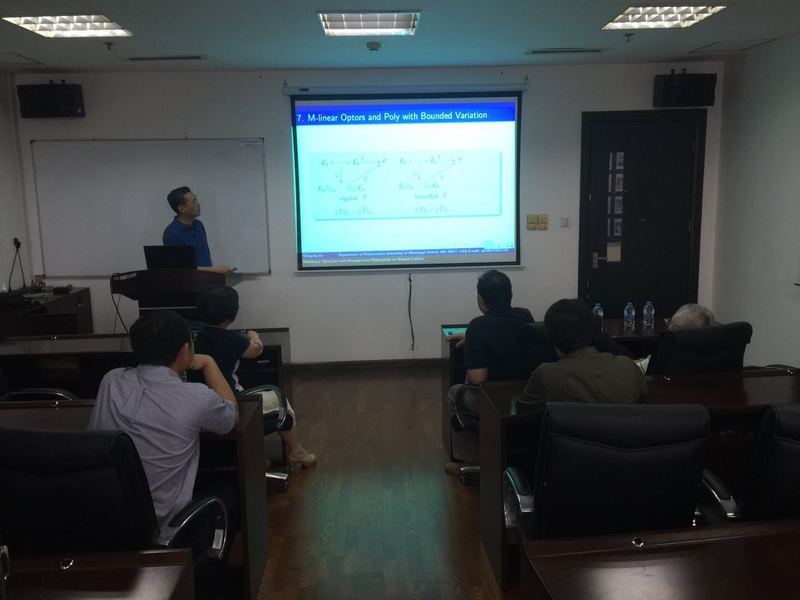 5月30日下午,应数理与统计学院应用数学研究所、数理与统计学院工程数学教学部、应用泛函分析科研团队的邀请,美国密西西比大学数学系教授Bu Qingying在行政楼1307学术报告厅作了一场精彩的学术报告,他报告的题目是Multilinear Operators and Homogeneous Polynomials on Banach Lattices。该讲座由张子厚教授主持,上海大学石忠锐教授和我校相关教师听了讲座。