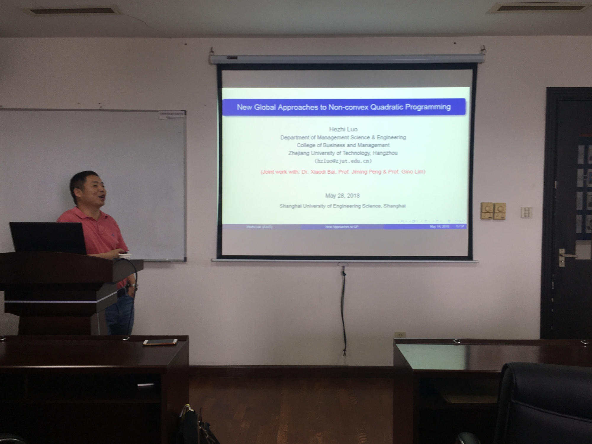 5月28日下午,浙江工业大学罗和治教授应数理与统计学院邀请在行政楼1307学术报告厅为广大师生作题为“New Global Algorithms for Quadratic Programming with A Few Negative Eigenvalues”的学术报告。报告会由数理与统计学院王国强教授主持。