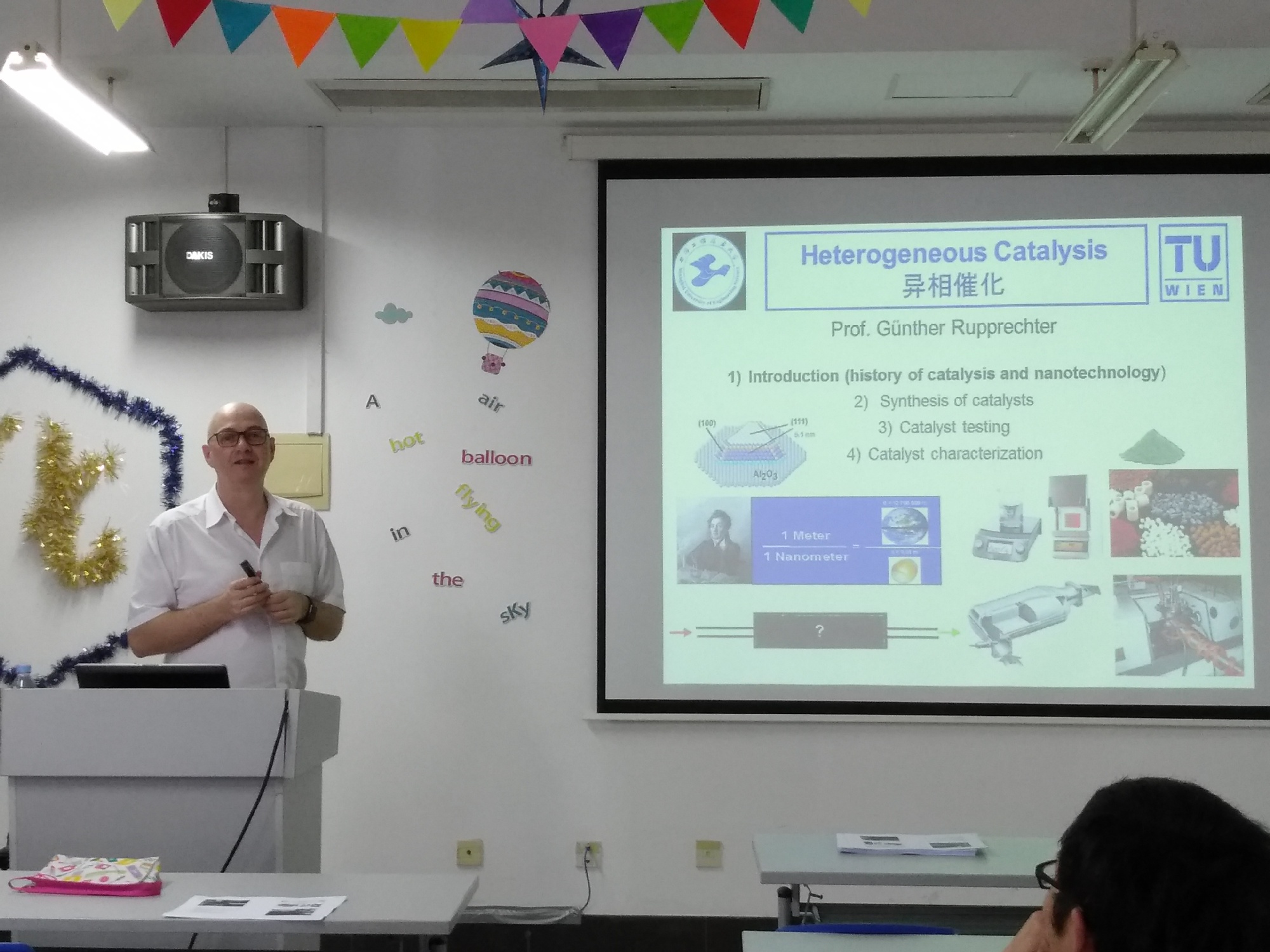 2018年6月7日上午,世界著名多相催化专家,奥地利科学院院士Günther Rupprechter应邀来校,在实训楼4号楼4405室给我校研究催化反应领域的全体师生作了《基于同步加速器光谱学和表面显微镜研究工业级和模型催化剂的催化反应》的专题讲座,讲座由任新峰副教授主持。