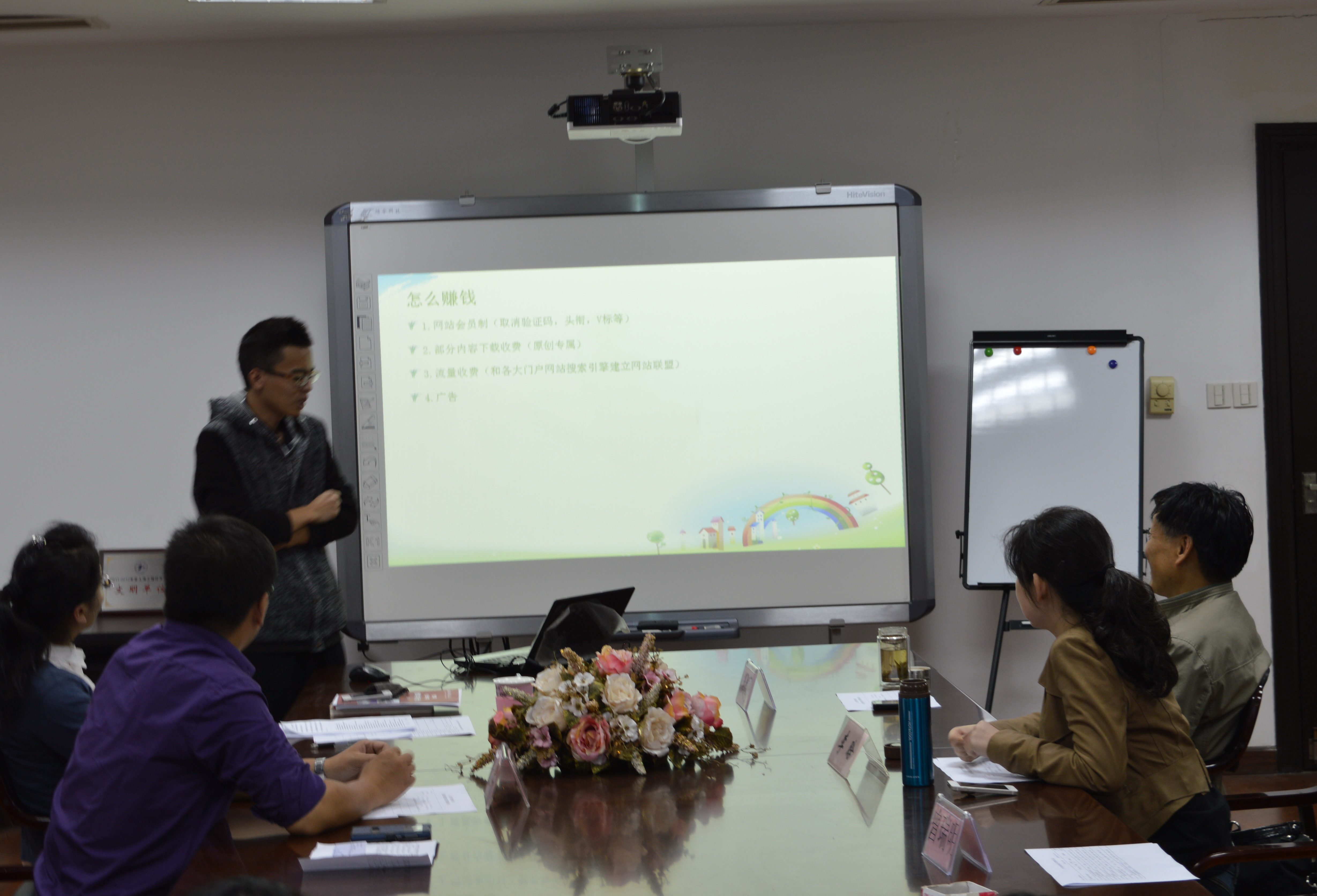 邱梦华代表评审组进行发言,邱老师认为学生们的选题有想法,值得庆幸,但更重要的是后继的研究要更应深入的思考与调查。在创业课题的组长答辩的过程中,张健明老师强调,创业应重视盈利模式,并就每个项目的吸引力和盈利模式与学生展开了激烈的讨论。各位专家老师为答辩同学点灯指路,拓宽了学生们的思路。在接下来的创新课题答辩的过程中,每一位老师都全神贯注地听同学们的讲述,并犀利地指出讲述过程中存在的错误和漏洞。对于答辩者思考方向的错误,专家们都给予及时的矫正。张健明老师深入地剖析了各组答辩中存在的问题;邱梦华老师准确地指出了PPT上的错误;李晗老师提出了修改的建议;张强老师指出了每一组的不足之处。同学们在表述了自己的想法后认真记下专家们的一言一语,避免课题研究陷入误区。