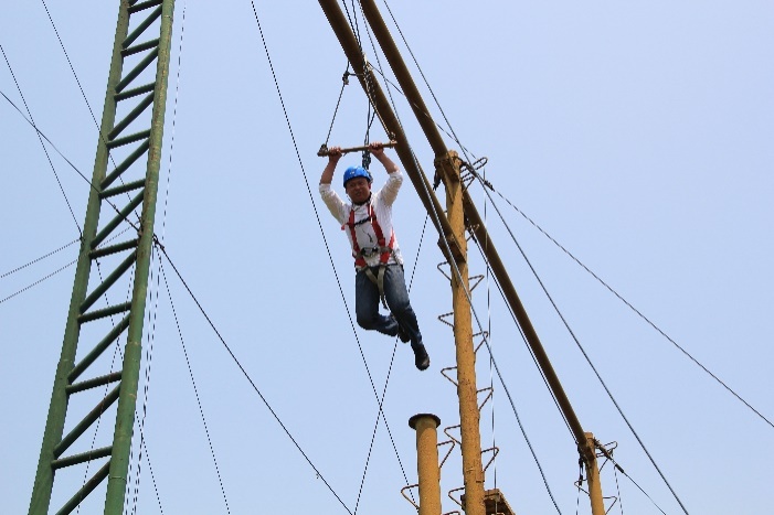 “这个项目看起来危险,但实际很安全,只是你们必须战胜内心深处的恐惧。”教练告诉学员。尽管有害怕、有担心,但学员们都勇敢面对,在教练的指导下迎接挑战。“站在那么高的地方,想站立起来都成为一件似乎是不可能完成的任务。但只要勇敢地跳出这一步,就会发现,自己很棒。”学员曾国辉说,“在今后的工作中,面对困难,我们一定要相信自己,全力挑战。”