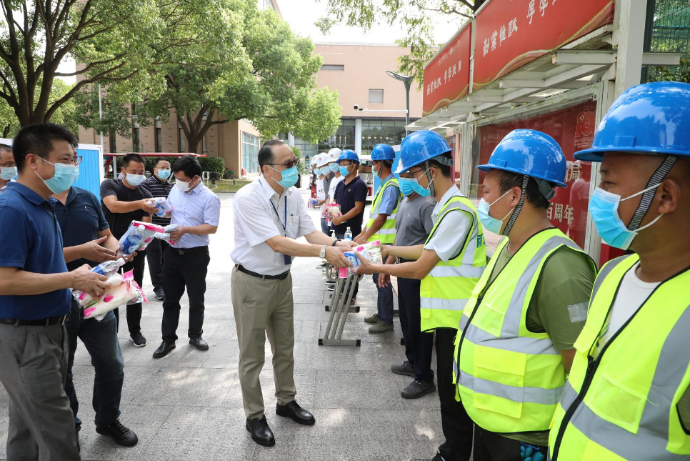 8月23日,俞涛校长、姚秀平副校长一行来到松江校区,先后走访了保卫处监控室、门岗、教学楼、食堂和学生公寓大修工程、体育馆修缮工程、图文信息中心LED屏改造现场,亲切慰问了奋战在一线的教职工、施工工人和项目管理人员,对他们冒酷暑战高温,为学校建设发展所付出的辛勤努力表示感谢。校领导叮嘱大家夏季高温作业时,要坚持常态化疫情防控,注意防暑降温,确保安全作业。