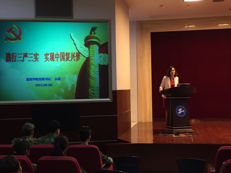 为让2015级新生更好地了解党的基本知识、掌握入党要求和入党程序,帮助新生树立正确的指导思想,端正入党动机,鼓励2015级新生积极向党组织靠拢,晚19:00服装学院党委在松江校区志宏堂开展了以“践行三严三实实现中国复兴梦”为主题的新生入党启蒙教育。出席大会的有服装学院党委书记袁蓉、服装学院党委副书记李扬以辅导员、服装学院全体2015级新生。