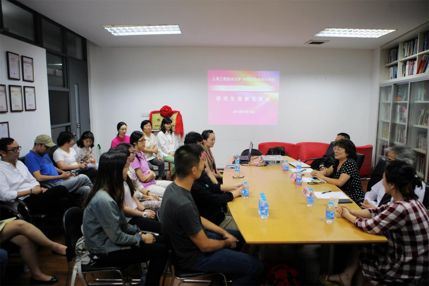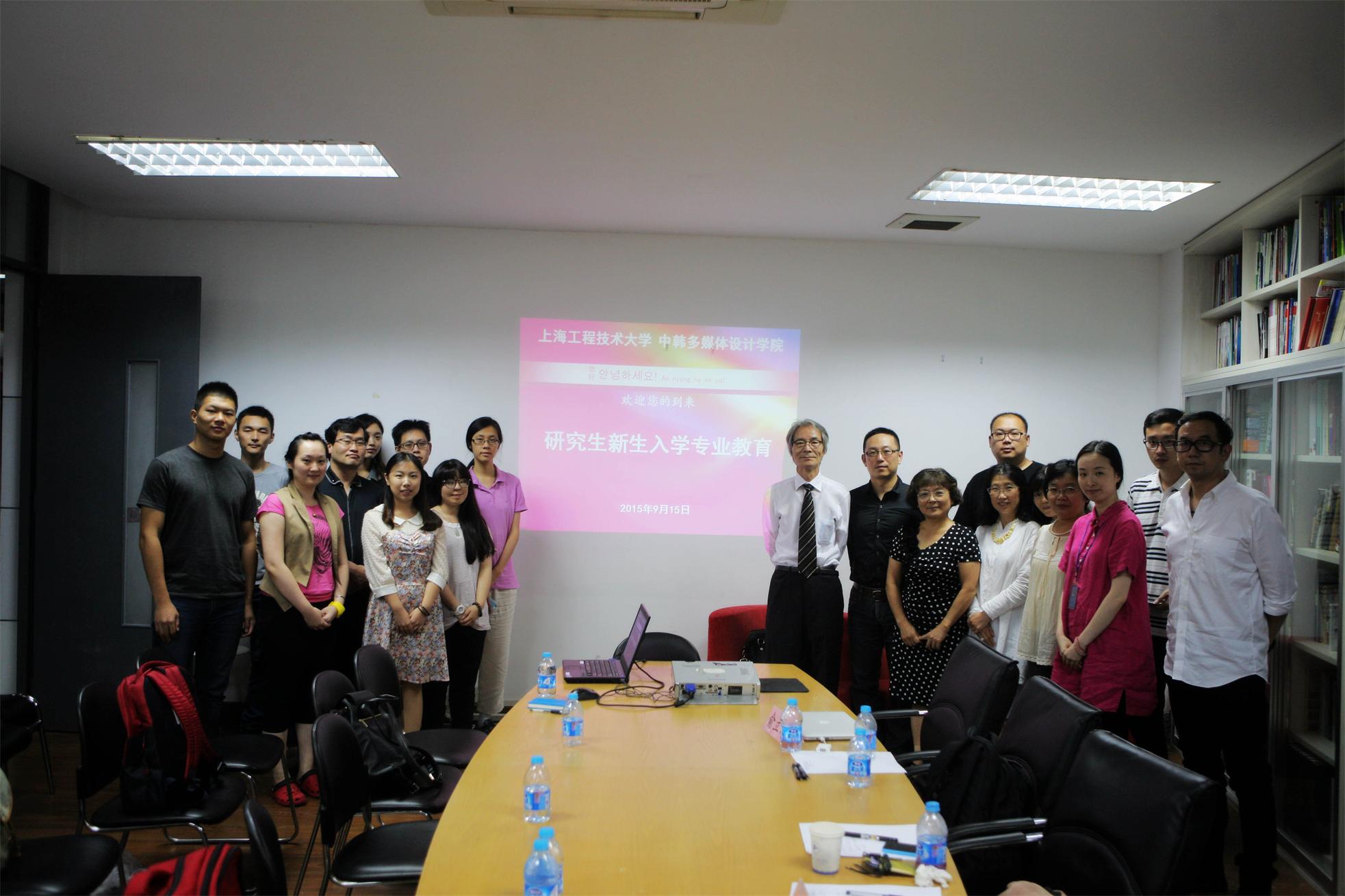 9月15日下午,中韩多媒体设计学院2015级研究生入学教育在艺术楼多媒体会议室拉开序幕。中韩多媒体设计学院院长、研究生导师唐幼纯教授,中韩多媒体设计学院韩方院长、研究生导师金钟琪教授,研究生导师章颖芳副教授,吴志恩老师,副院长张瑜老师,学院教学工作负责人咸妍老师,研究生秘书宁书家等老师,学办、院办相关负责人,学院的研究生企业导师、上海张江超艺多媒体系统有限公司执行总裁俞立昂和中韩多媒体设计学院2015级全体研究生新生共同出席会议。会议由研究生导师樊荣老师主持。