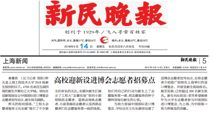 昨天是上海工程技术大学2018级新生报到的日子。4789名来自五湖四海的新生齐聚松江大学城。该校在迎新现场设立中国国际进口博览会志愿者宣传站点,新生报名踊跃。