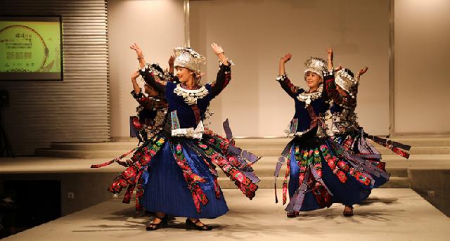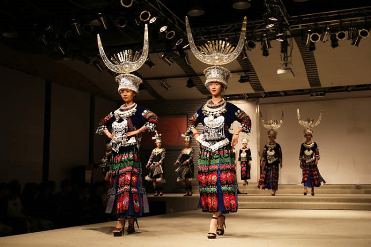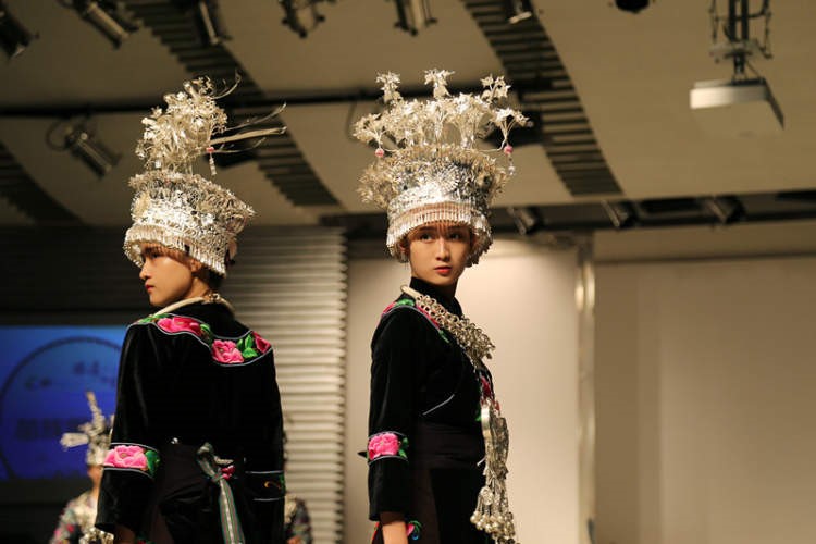 动态服饰秀演,大学生全程参与到非遗文化的传承过程。今天,在上海工程技术大学的T型台上,来自贵州省西江千户苗寨的姑娘和小伙和中法埃菲时装设计师学院、服装学院的模特学生们共同进行了一场苗族服饰文化的展演。