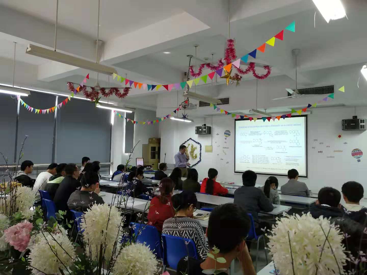 10月31日上午,著名有机合成专家,台湾淡江大学谢仁杰教授应邀来校,在实训楼4号楼4405室给我校研究有机合成方法学领域的全体师生作了《过渡金属催化的C-N多键加成合成杂环化合物》的专题讲座,讲座由饶品华院长主持。