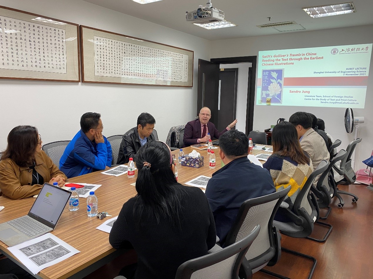 11月5日上午,外国语学院在行政楼1504会议室举办了“乔纳森·斯威夫特《格列佛游记》在中国——通过最早的中国插图来阅读文本”讲座,讲座邀请到上海财经大学“文本与印刷文化研究中心”主任、外国语学院文学团队负责人Sandro Jung来担任主讲人。钱慧敏书记与王刚院长参加讲座,学院科研骨干教师以及学生到场聆听讲座。讲座由张冰天副院长主持。