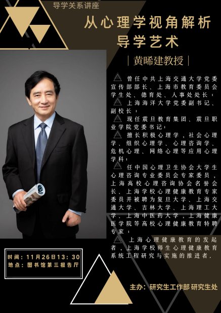 主讲人简介:黄晞建教授,曾任上海交通大学党委宣传部部长、上海市教育委员会学生处、德育处、人事处处长;上海海洋大学党委副书记、副校长;现任震旦教育集团、震旦职业学院党委书记。黄晞建教授擅长积极心理学,社会心理学、组织心理学、心理咨询学、危机心理、网络心理等应用心理学科。任中国心理卫生协会大学生心理咨询专业委员会专家委员,上海高校心理咨询协会名誉会长、上海学校心理健康教育专家委员并被聘为复旦大学、上海交通大学、吉林大学、上海理工大学、上海中医药大学,上海健康医学院等高校心理健康教育特聘专家;黄晞建教授是上海心理健康教育的发起者,也是上海学校师生心理健康教育系统工程研究与实施的推进者。