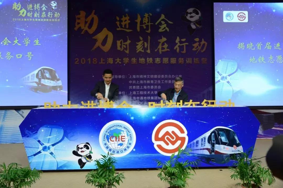 ▲上海市文明办副主任姜鸣和上海工程技术大学党委副书记鲁嘉华共同揭晓了本次进博会上海大学生地铁志愿服务口号:“助力进博会、时刻在行动”。