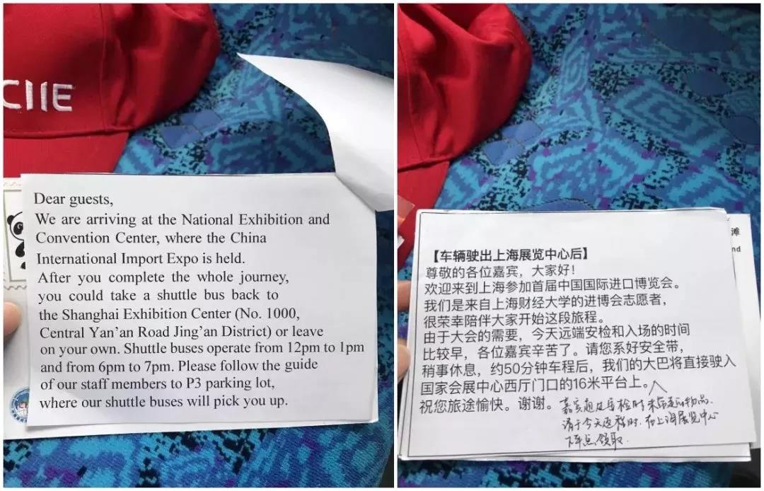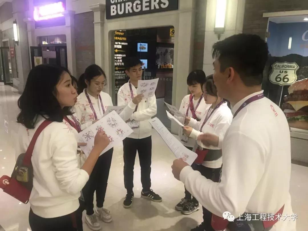 上海财经大学志愿者精心设计了播报手卡,播报手卡的正面是带有上海和进博元素的明信片。