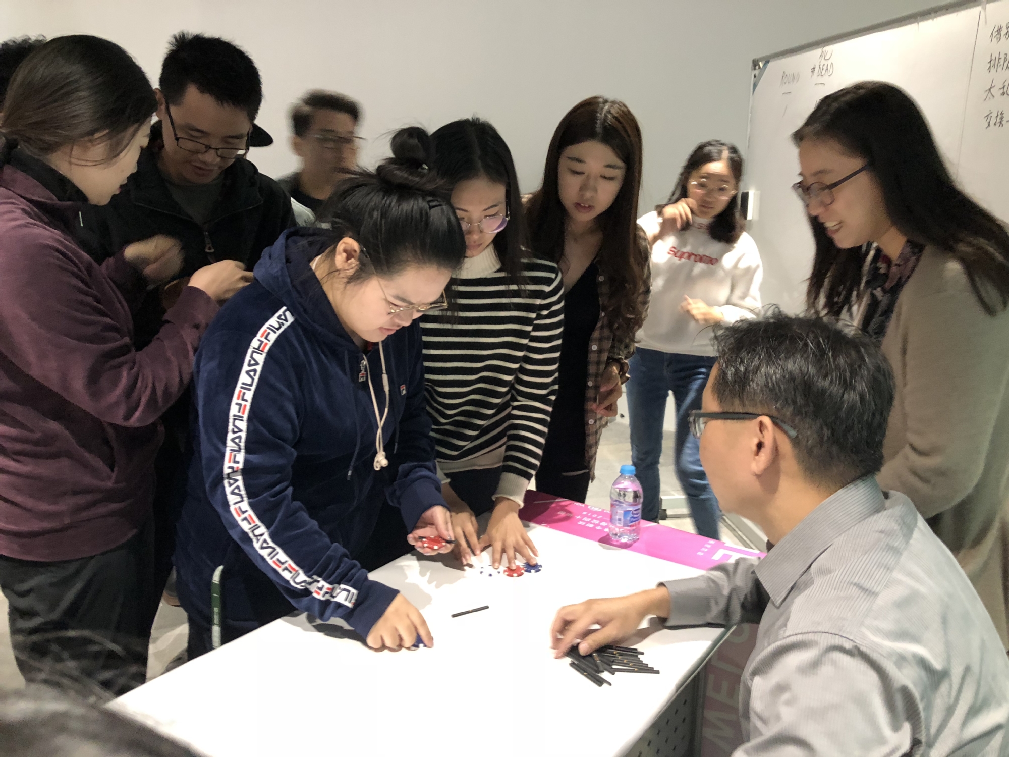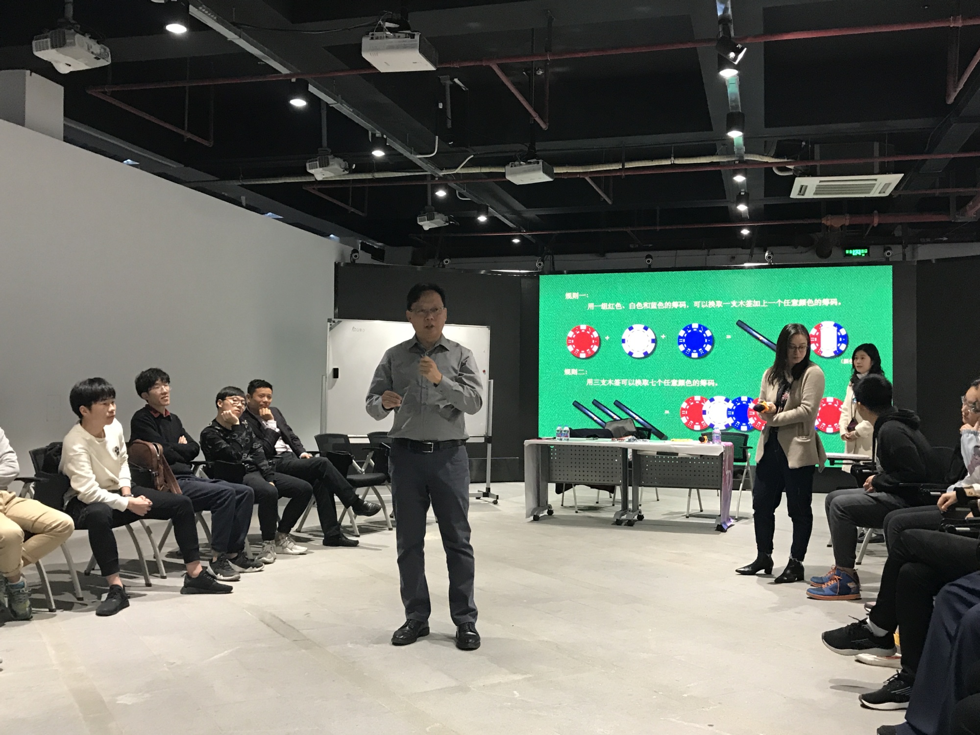 李教授这次带来的讲座采用了别开生面的美国游戏化教学方式展开,现场的28名同学参与了主题为“生存”的游戏体验。游戏道具为28根木签和红、白、蓝三色筹码若干。在游戏开始前,李教授告诉大家游戏的两条规则(规则一:用一组红、白、蓝的筹码可以换取一支木签和一个任何颜色筹码;规则二:用三支木签换取任意七个颜色的筹码),并且发给每位同学两个任意颜色的筹码,同学们需要在有限时间内完成游戏,游戏结束时手中有木签的同学即为存活者,游戏的最终目的是让所有参与者都生存下来。游戏一共玩了七轮。前三轮游戏的最终存活者人数均为半数左右,参与游戏的同学在游戏进程中逐步认识到了团队合作与领导力的重要性。在第四轮游戏开始之前的讨论环节,同学们开始由小组讨论变成集体讨论,并有一个同学站出来作为28人团队的领导者给同学划分不同的角色和任务,但是游戏的结果并没有好转,存活者人数反而更低。同学们开始深入思考游戏的时间问题、团队分组问题、换签排队问题,在不断总结经验教训之后,终于在第七轮游戏中取得非常好的成绩,28人中有27人存活了下来。李教授对同学们在游戏化教学过程中表现出来的团队合作精神、沟通能力大为赞赏,并且对此次游戏化教学做了总结。游戏化教学的方式让学生们积极参与其中,主动思考问题、分析问题和解决问题,并且在此次游戏的参与过程中意识到一个团队或组织中有领导、有分工、有沟通合作的重要性。