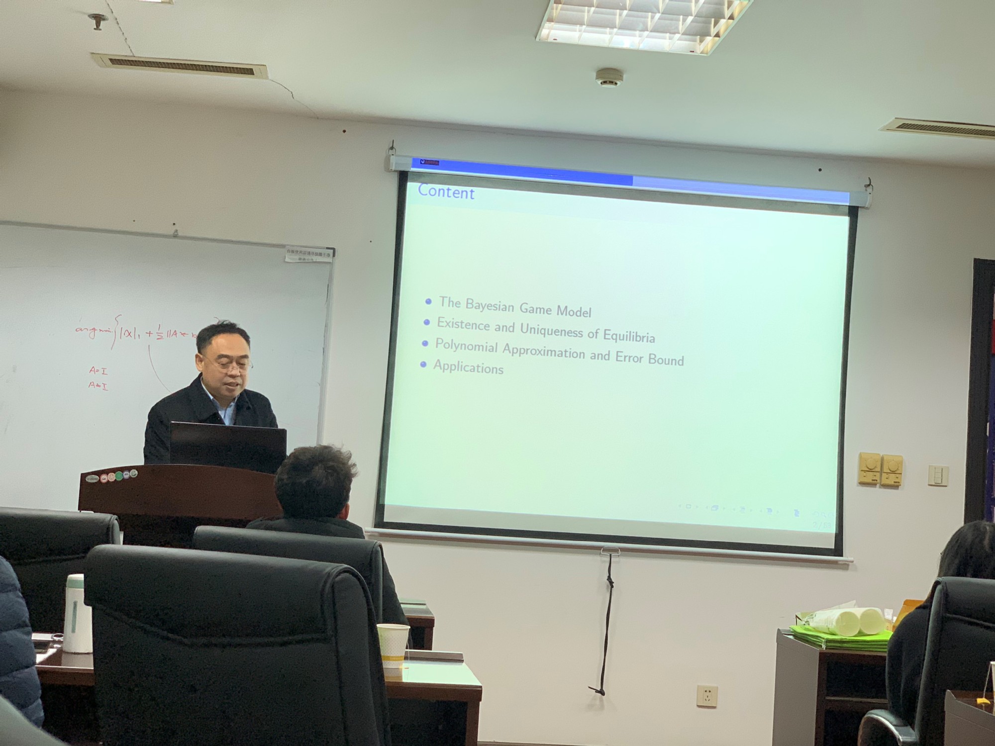 张立卫教授首先用通俗易懂的语言讲述了贝叶斯博弈模型以及贝叶斯纳什均衡等基本概念。接着,张教授重点讲解了贝叶斯纳什均衡的存在性、唯一性以及近似多项式贝叶斯纳什均衡的收敛性结果等。最后,张教授展示了该问题在寻租博弈和古诺博弈中的应用以及数值结果。张教授不仅为与会师生带来了贝叶斯博弈研究领域的最新研究成果,而且激发了广大师生对博弈论及最优化算法研究的浓厚兴趣与求知热情。报告结束后,张教授与参加讲座的青年教师和研究生就讲座内容以及最优化领域的国际前沿和热点问题做了深入的交流与探讨。