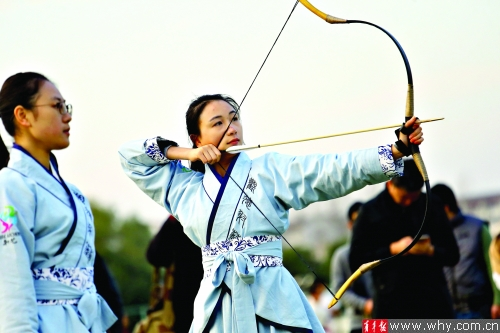 穿着汉服的年轻人手持长弓,相互拱手致意,和着古乐的节拍,开始挽弓搭箭,屏气凝神,咻的一声,直中靶心……这是一幅出现在上海对外经贸大学“2015全国大学生射箭(射艺)邀请赛”的场面。历史悠久的传统射艺,正峰回路转“重回”校园,重新成为年轻人修养品德情操、倡导君子礼仪、追求体态与心志正直的创新载体。