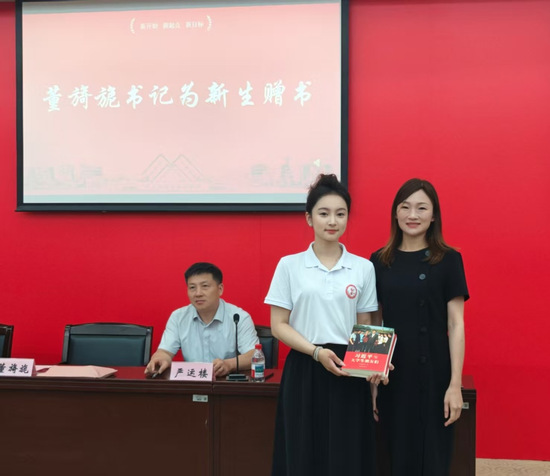 学院党委书记董旖旎为新生代表赠书,并启发与激励同学们:既要刻苦钻研学问、领悟信仰力量,更要坚守青年应有的赤诚与纯粹,以新时代青年马克思主义者的姿态,不忘初心、砥砺前行。随后,董旖旎为新生讲授开学入党启蒙教育第一课——《党章的历程》。