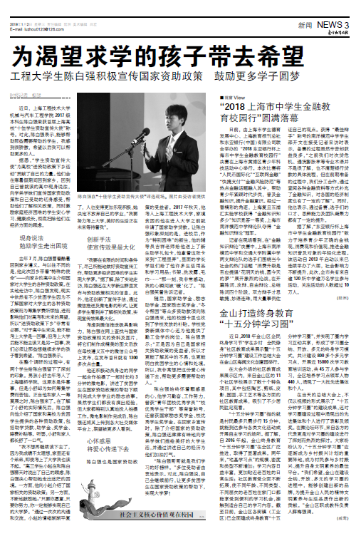 近日,上海工程技术大学机械与汽车工程学院2017 级本科生陈白强荣获首届上海高校“十佳学生资助宣传大使”称号,对此,陈白强表示,能够帮助那些需要帮助的学生,我感到很骄傲,希望以后我可以帮助更多的人。