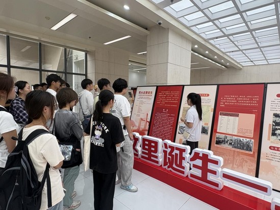 在讲解员的带领下,同学们有序参观了“党从这里诞生——上海市珍贵红色珍档联展”。此次联展是松江区、青浦区两区九校共同承接的红色育人项目,上海市档案局(馆)提供近200件珍贵档案,聚焦1921-1933年中共中央在上海的奋斗历程。此外,“上工程的红色印记”版块呈现了我校自1978年建校以来党建引领发展的历程,展览为学子搭建了触摸红色历史的“实景课堂”。