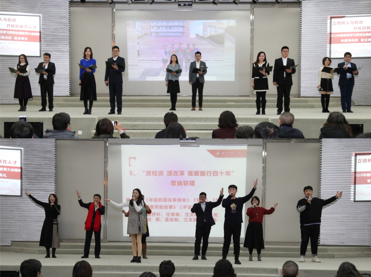 培训班学员代表航空运输学院(飞行学院)赵梦影、管理学院吉祥作了交流发言,表示通过培训班的学习收获颇丰,对辅导员这一平凡而伟大职业的认识和理解更深入,引起了辅导员们的共鸣。武装部陈磊、艺术设计学院由馨媛分别以军训学生教官和援藏学生为切入点,声情并茂的作了题为《最可爱的54个人》和《用青春赴西藏路 于平凡筑中国梦》主题演讲,令全场动容。结业典礼上,来自不同学院的辅导员代表还表演了《我们是工程大辅导员》诗歌朗诵和“贺校庆·颂改革·砥砺前行四十年”歌曲联唱,现场气氛热烈,充分展现了我校辅导员积极向上的精神风貌和奋发作为的团队氛围。