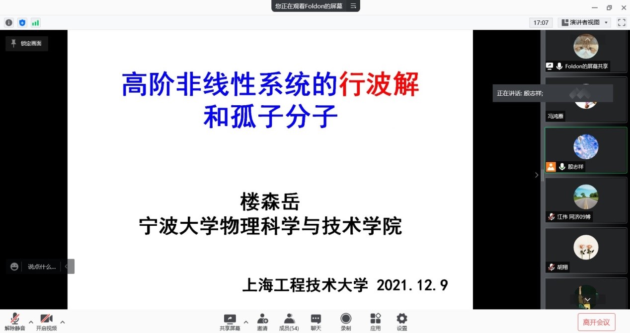 为进一步提升学院科研创新能力和开展有组织科研活动,更好的把握可积系统与高阶偏微分方程孤子理论的前沿动态,宁波大学物理科学与技术学院博士生导师楼森岳教授受邀于12月9日在线为我校师生作题为“高阶非线性系统的行波解和孤子分子”的学术报告。报告会由殷志祥院长主持,学校教师与研究生共计100余人参加。