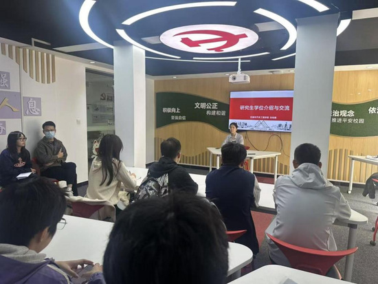 研究生“驻楼导师工作站”活动则聚焦“研究生学位介绍与交流”和“研究生培养工作指导与交流”,邀请学院研究生秘书张柏薇、蔡晓琳做专题分享。蔡晓琳结合学院招生培养全流程,从研究生报名资格、初复试评分标准、入学后培养方案制定、导师选择、中期考核要求等方面逐一解析。张柏薇讲解了学位取得的核心条件与细则要求,重点拆解了科研成果标准,明确发表论文的期刊级别、收录要求及认定规范,并围绕实践环节展开细致说明。