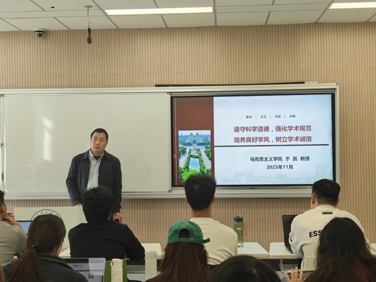 为强化学术规范,加强科研诚信建设,引导学生恪守科学道德、坚守诚信底线,11月5日,马克思主义学院举办了主题为“遵守科学道德 强化学术规范 培养良好学风 树立学术诚信”的学术讲座。马克思主义学院副院长于凯教授主讲,学院2025级全体学生参加。