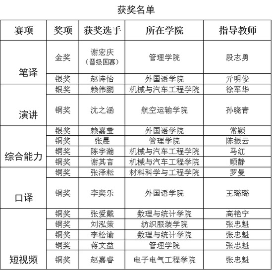 近日,2025年“外研社・国才杯”“理解当代中国”全国大学生外语能力大赛上海赛区比赛圆满落幕。在演讲、口译、笔译、综合能力及短视频五个赛项中,我校学生发挥出色,凭借扎实的语言功底与创新思维,荣获一金三银十一铜的优异成绩,管理学院谢宏庆在笔译赛事中成功突围,入围国赛。