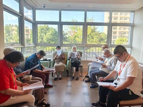 10月9日,蒋科尔(右一)带领老人们开展读书会活动。受访图者供