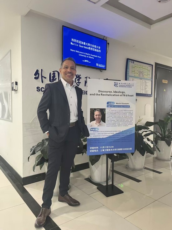 马丁·瓜达多教授为本科生讲授《语言学概论》课程,以萨尔瓦多西部纳瓦特尔语复兴研究为内容,呈现语言学的魅力,赋予语言学在人类文明延续中的意义。他的专题讲座“Discourse, Ideology, and the Revitalization of Náhuat”吸引了上海多所高校教师现场聆听。讲座从民族志视角出发,系统阐述其团队长期扎根社区的质性研究成果,通过参与式观察、访谈及话语分析等方法,解析纳瓦特尔语复兴过程中的历史记忆与当代发展愿景的双重作用机制,及该语言从濒危状态转为文化纽带的动态过程。