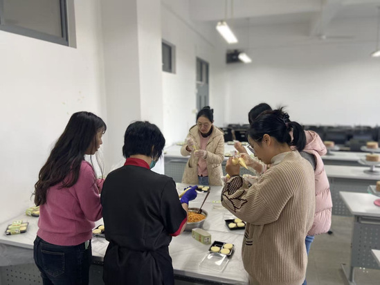 专业烘焙师现场指导,女教师们化身“甜点师”。从称量配料、打发奶油到裱花装饰,大家分组协作,时而交流烘焙心得,时而互相帮助解决操作难题。实验室的严谨与烘焙的创意碰撞出别样火花:有小组设计“拉布布蛋糕”造型,将流行特色融入甜品;更有小组创作“五彩缤纷”糖霜图案。实训中心4418变身“甜蜜工坊”,笑声与赞叹声此起彼伏。