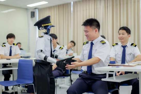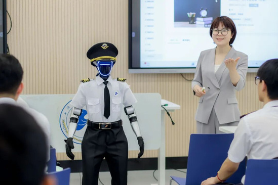 在这堂“飞行专业英语(口语)”课上,人形机器人“小C”用地道的英语为学生示范航空术语的标准读法,并通过情景模拟功能,重现塔台通话、机组协同等真实航空场景。